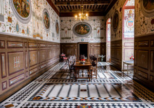 Im Arbeitszimmer mit Vogelmalereien an der Decke.