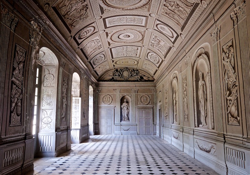 Im Arbeitszimmer mit Vogelmalereien an der Decke.